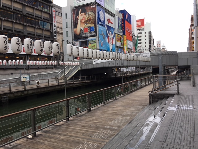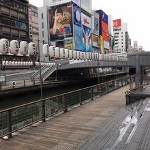 道頓堀川の川沿いの遊歩道です。地面から1段下がったところにあって、商店によっては、このとんぼりリバーウォーク側からも出入り出来るようにしているところもありました。太左衛門橋から戎橋までの短な区間しか歩きませんでしたが、とても雰囲気があって良かったです。