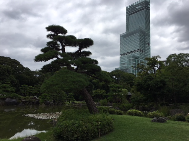 天王寺公園内にある和風の庭園です。動物園には入らずに右に折れると、旧黒田藩蔵屋敷長屋門があり、その先に市立美術館とこの慶沢園がありました。慶沢園は中に入るのに入場料150円が必要でした。中に入ると、ちょうど良い大きさの回遊式庭園になっていて、これぐらいの大きさがちょうど良いかなと感じました。庭の向こうにはあべのハルカスが見えて、何か対照的でした。