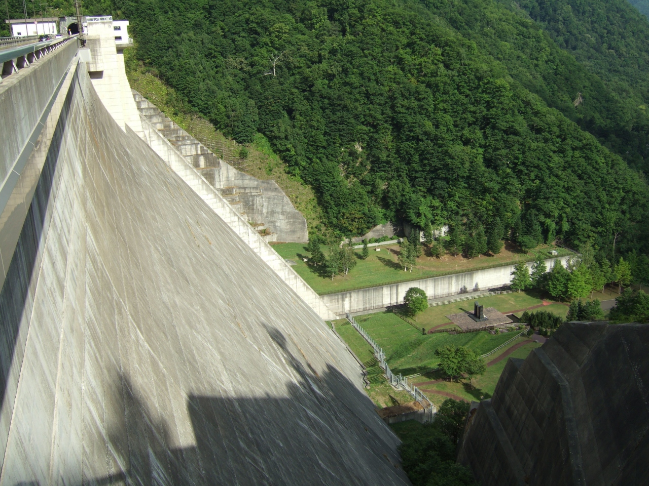 定山渓ダムの堤体の真下に広がる園地。堤体の手前にフェンスはありますが、堤体を間近に見ることができるのでとても迫力があり、ダムマニアじゃなくても興奮してきます。ダムからの放流なんて見られたらたまらないと思います。