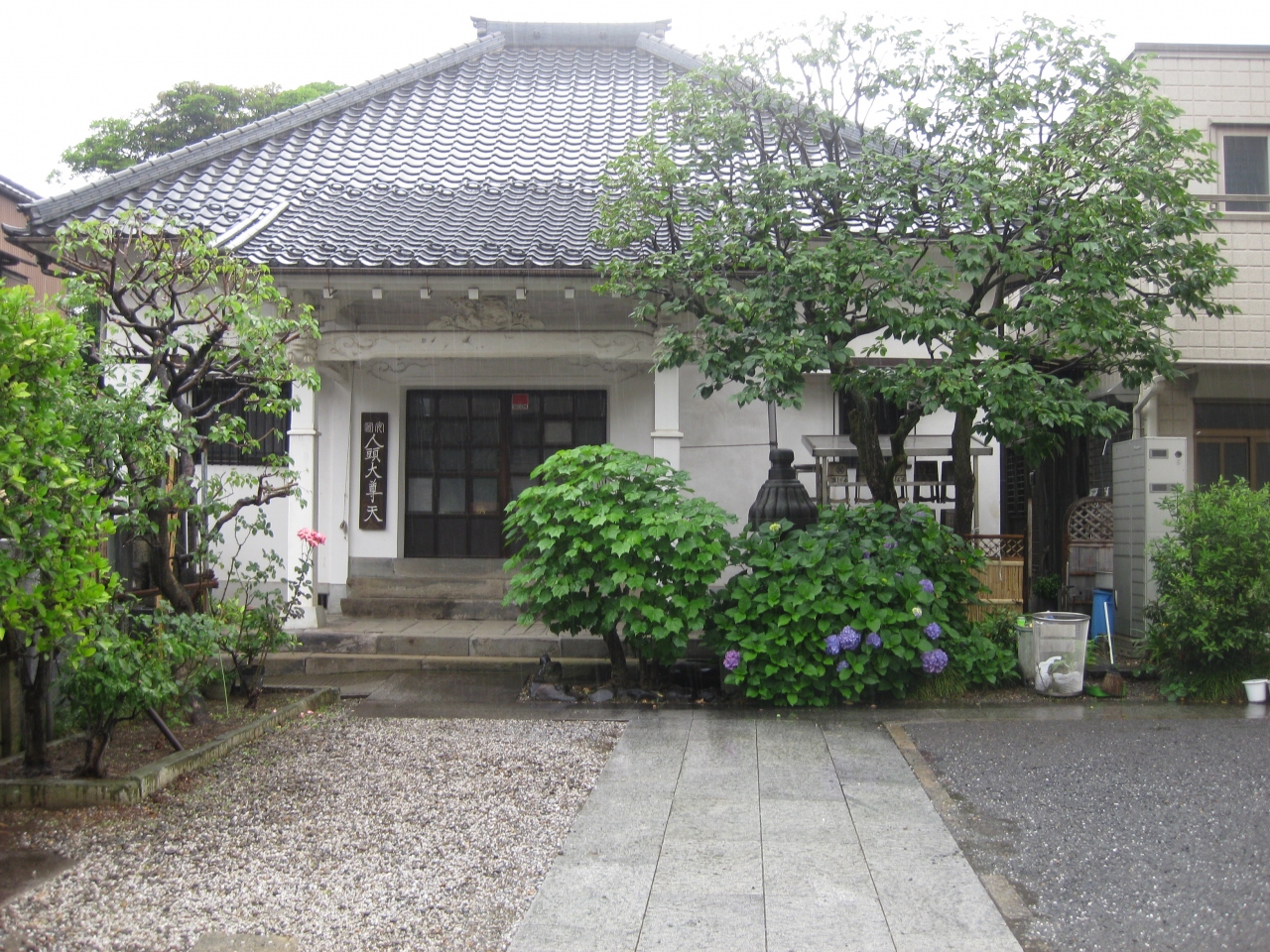 言問通り谷中6丁目交差点の北側下に建つ日蓮宗寺院で寛永7年(1630年)創建されたそうです。白色の二つのコンクリート柱の山門と境内の白色の壁の本堂とお寺とは思えない洒落た洋館の様な雰囲気です。境内は綺麗でアジサイが咲いていました。古さと格式を求める小生には好感持てない寺です。