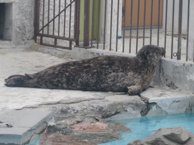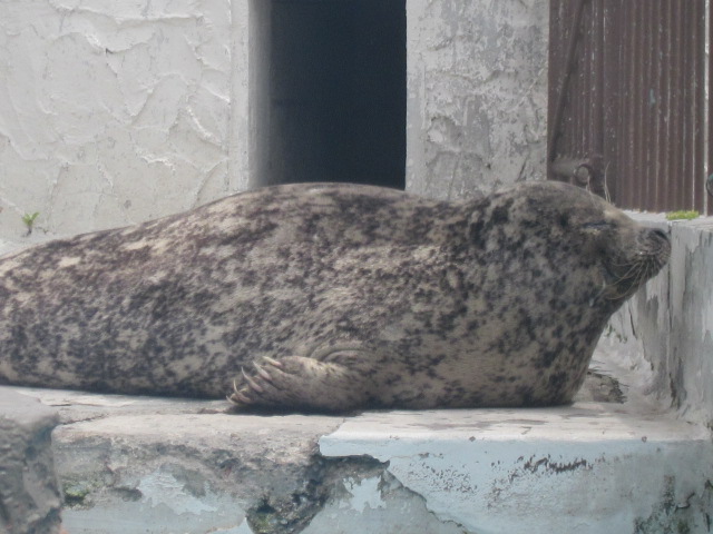 ここは海獣舎という名称になっていますが、現状では、”アザラシ舎”となっていて、北海道の近海に生息している代表的な二種(ゼニガタアザラシ・ゴマフアザラシ)が飼育されています。私は6月上旬の少し暑い位の気候の中で眺めましたが、彼らにとっても暑かったようで、やる気なく寝そべっている姿とかが、とても可愛かったです。