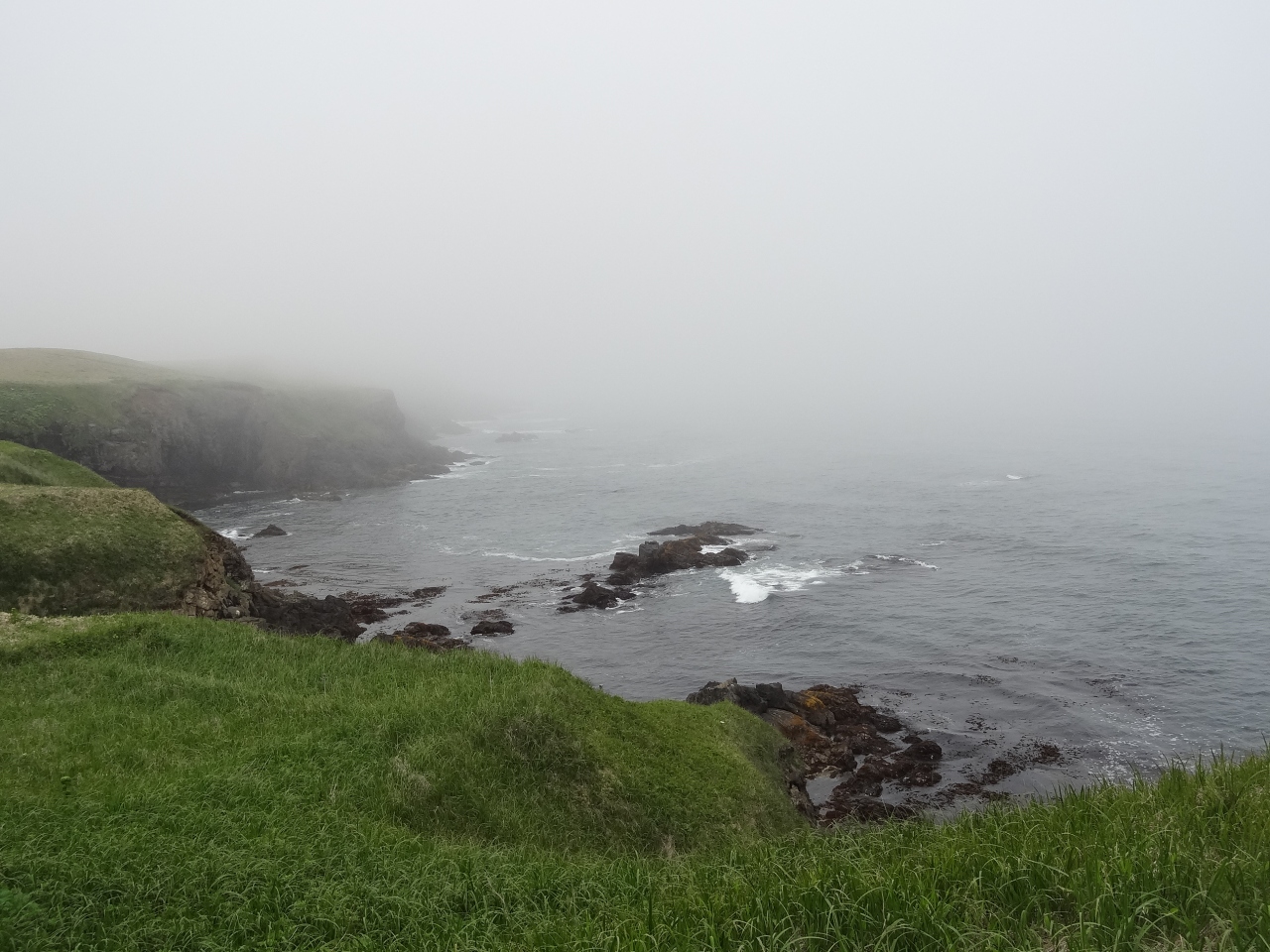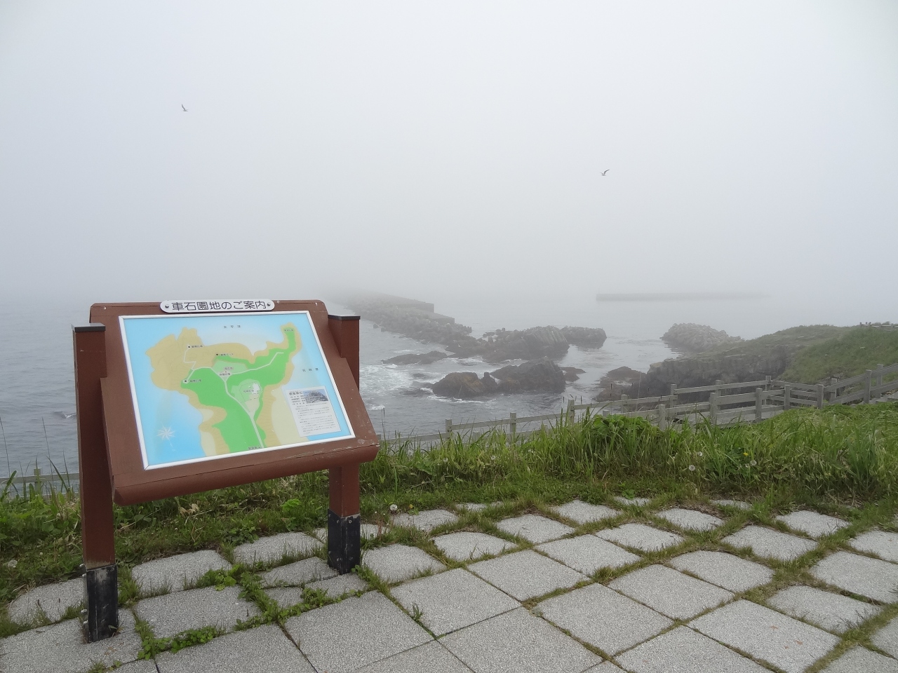 駐車場から岬の見どころまで徒歩2分ほど。箱型の小さな灯台を右手に見ながら歩いて行くと、下にまで伸びる遊歩道が海近くまで続いています。周りは、柱状節理の岩肌がグニャっと曲がって車輪のようになっています。これが国の天然記念物「根室車石」です。実に見事です。海面近くまで来ると、波が打ち付けて下の岩が滑りやすくなります。柵がありますが、足元には十分注意しなければなりません。この岬では海の景色よりも岩の凄さに圧倒されます。