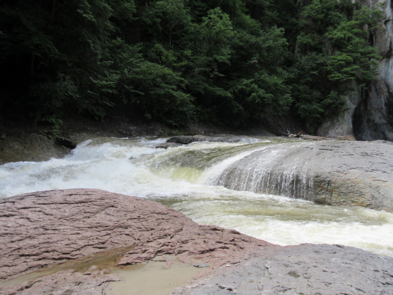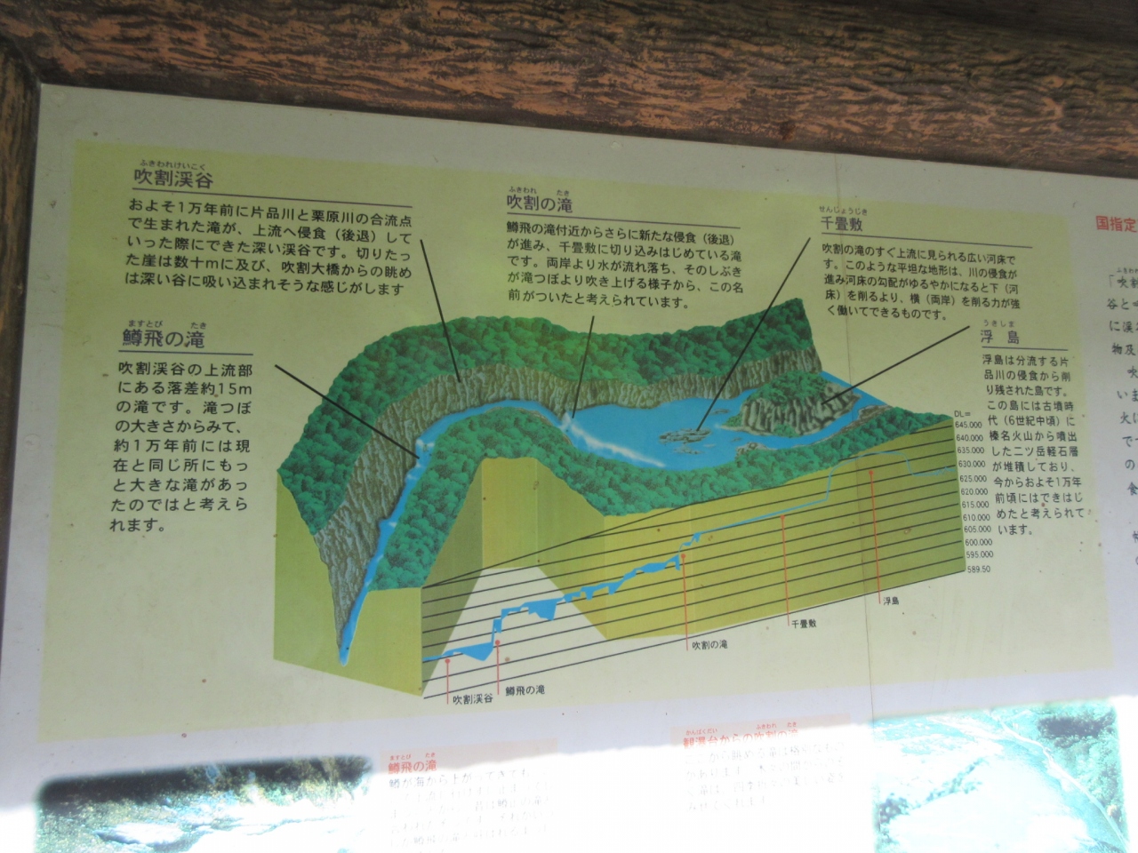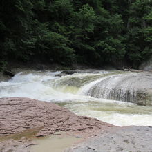 遊歩道を進むと、吹割の滝より先にみえるのがこちらの滝。滝というほどの迫力は感じないが、マイナスイオンは感じます。大きさからみて、約1万年前から同じ場所にはもっと大きな滝があったらしい。その頃の大きな滝をみてみたい。