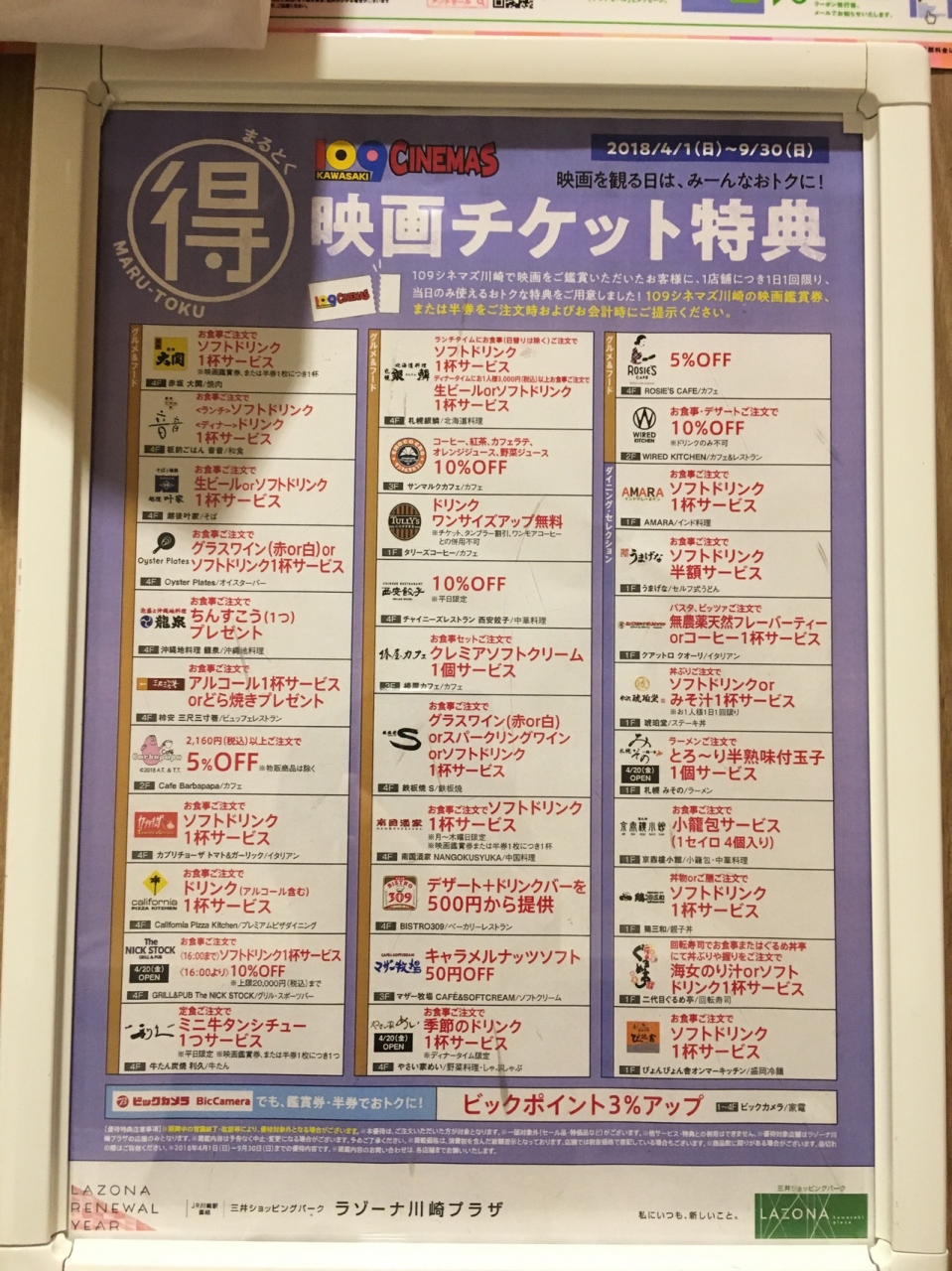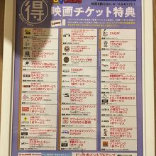 川崎のラゾーナにある109シネマズで映画を見たら、ラゾーナの中のショップやレストランでチケットを見せるだけで特典が受けれました。映画を見る前でもチケットがあれば特典が受けれるのでとてもお得でした。また映画を観る際は特典を利用したいです。