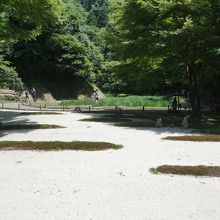 つつじの大刈込があって、その奥にはコケと白砂の広場。そのまた奥にハナショウブ畑と三段構成。丸窓からそれを眺めると奥行きのある眺めになるんですね。ただ、こちらに入ってしまうと、手品の種明かしを見たような感じ。全部が丸見えになってしまうので、期待ほどの感動はないかもしれません。