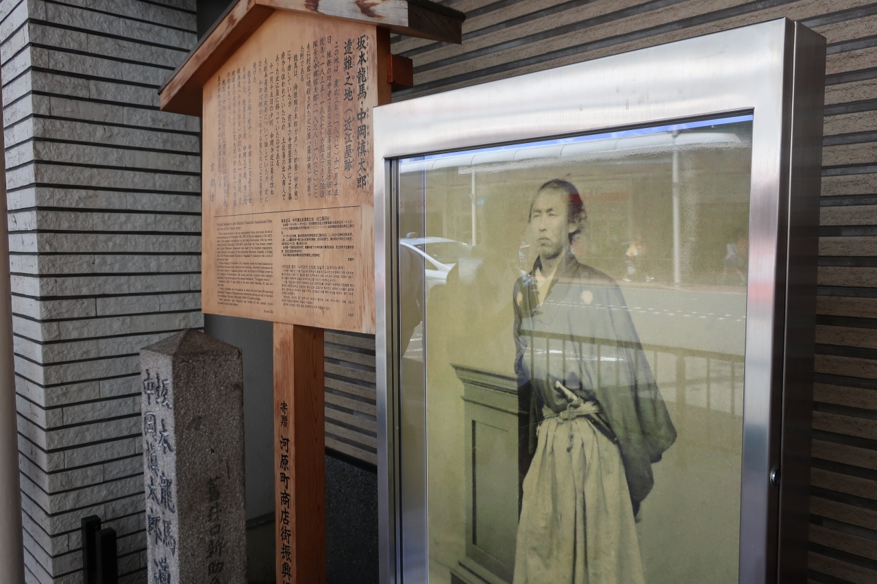 坂本竜馬遭難の舞台として有名な京都の寺田屋と近江屋だが、現代における姿は対照的だ。寺田屋は存続しているが、近江屋は形がない。そのせいか、歴史の転換の舞台の割には地味な扱いだ。初めて訪れた学生のころは旅行代理店があり、低い石碑が一本立っているだけだった。その前に行った寺田屋が派手に竜馬との関連をうたっていただけに格差を感じた。今回、久しぶりに訪れたが、竜馬の写真と立札が追加されており、少し目立つようになっていた。