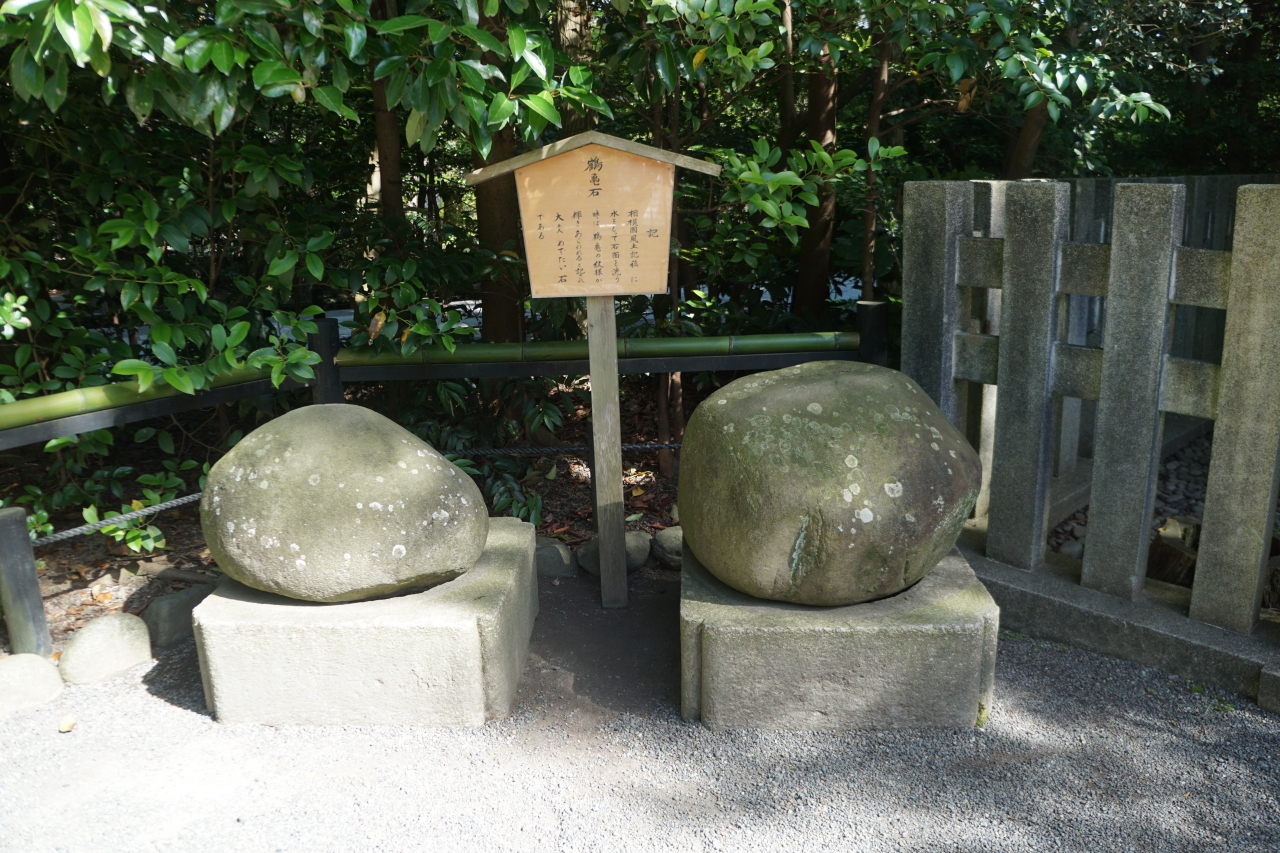 鶴岡八幡宮の鶴亀石は若宮から宝物館の方に少し進んだところ。相模国風土記に水をもって石面を洗うと鶴亀の文様が輝きあらわれると記されているありがたい石だそう。パッと見だとちょっと多く過ぎるかもしれませんが、形はまあるいので神社にある力石みたいです。