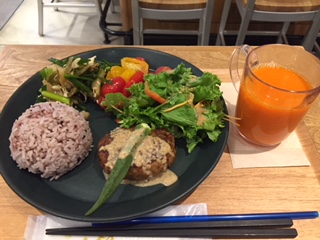 銀座東急プラザ地下は気軽にランチが利用できるお店が多いのでよく行きます。11時過ぎに行ったらすいていました。通常主食1品・副食2品で980円ですが、特別デーで副食3品選べました。主食はヘルシーハンバーグ、副食は自社農園や全国の生産地から届く野菜がたっぷりあって、グリーンサラダ、ザーサイ、トマトを選びました。おいしくておなか一杯になりました。