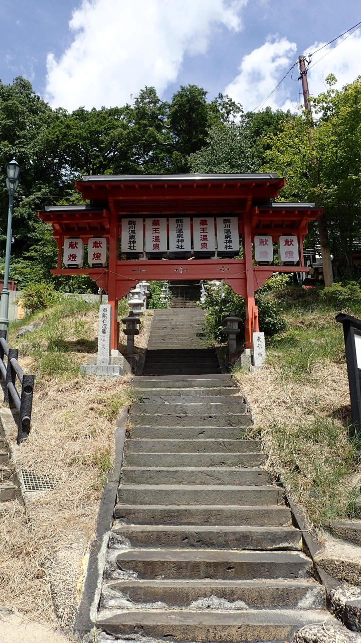 上湯共同浴場の奥に特徴的な門があり、階段状の参道が上まで続いている。