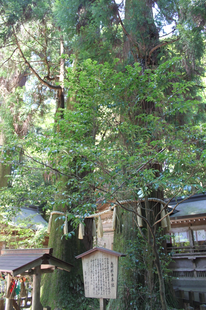 高千穂神社の境内には、2本の杉の幹がつながった「夫婦杉」と呼ばれる杉の木があります。