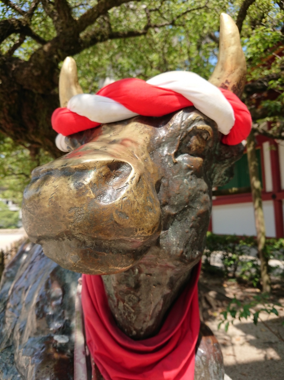 学門の神様である菅原道真公を祀る太宰府天満宮。牛の像がいくつもまつられています。道真公が牛に乗って来られたのかしら。受験生は、ハンカチで牛の頭を撫でて、そのハンカチを持って受験にのぞむとよろしいと以前テレビで言っていた。