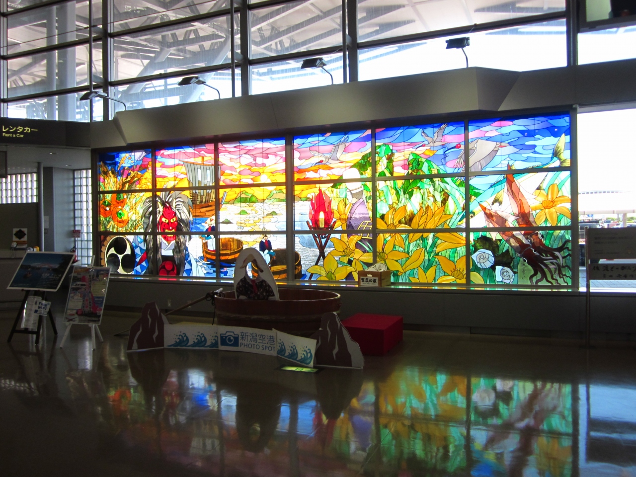 特に1階フロアー中央のステンドグラス作品「佐渡ものがたり」は印象に残るところ。昨今の主要地方空港も本当に立派に成ったと思います。