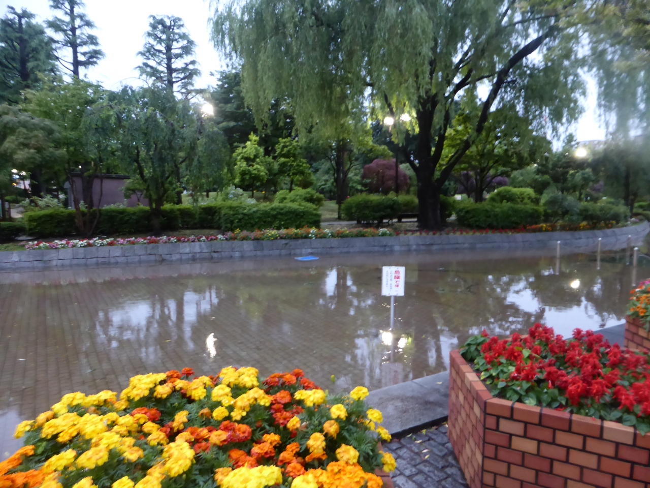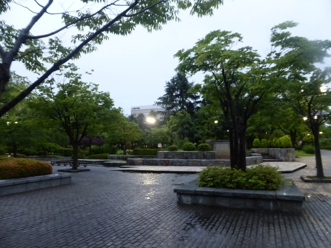 木製遊具や噴水、モニュメントと緑が豊富にあり、いかにも市民の憩いの場といった感じの公園です。