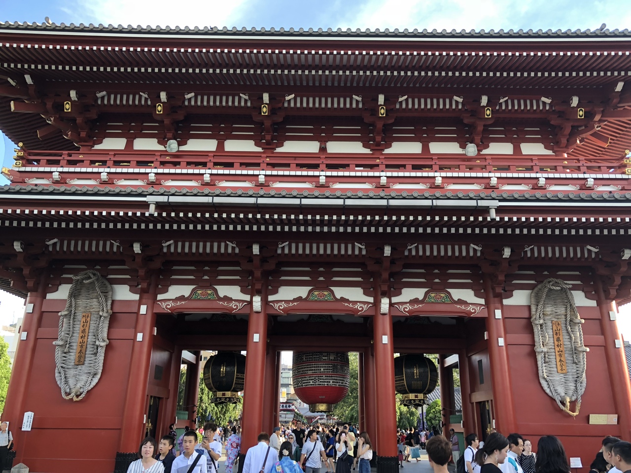 雷門を通り抜けて仲見世通りを歩いていくと、終点にある門です。昭和39年に建立されたので、鉄筋コンクリート造りの新しい門になります。浅草寺側の門の両脇には、山形県村山市から奉納された巨大な草履がありました。