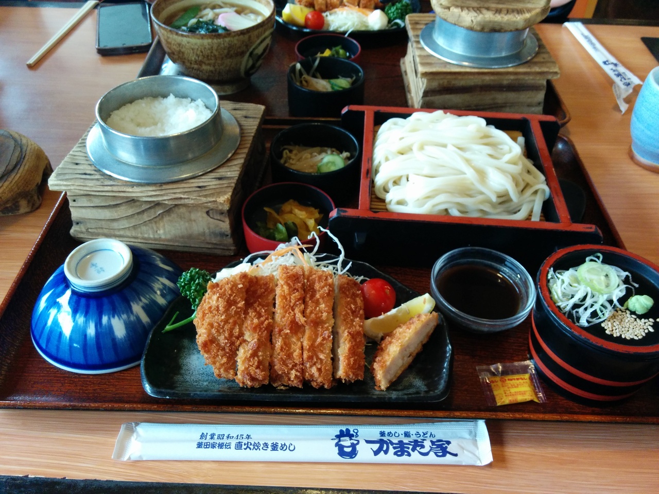 みなさんこんにちは、ふとももぷるぷるです。平成30年4月25日に群馬県邑楽町にあるかまだ屋本店に行ってきました。かまだ屋本店さんは、釜飯のお店ですが定食も行っており特に限定30食のうどん定食は、680円で日替わりのおかず、小鉢、おしんこ、冷たいうどん又は、温かいうどん、自家火炊き銀シャリ(ミニ釜)という内容です。この日のおかずは、とんかつでした。ここは、ご飯がとても美味しいかったです。