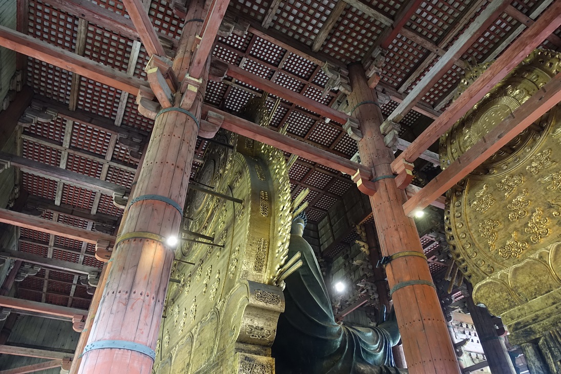 大仏殿に入ると、すぐに大仏が目に飛び込んできます。中に入ると、大仏の周りを一回りできるようになっていて、横から後からと見ることができます。大仏のほかにも、国宝や重文が祀られていて、見ごたえ抜群です。三脚を使わなければ、写真撮影もOKです。