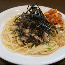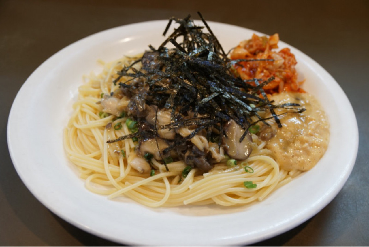 アサリのメニューだけでも10種類あるが、ついついスペシャルを注文してしまいます。アサリに加えて、シメジ、椎茸、納豆、キムチがトッピングされます。さらに、ソースもジンジャーかガーリックを選ぶことができます。ジンジャーがばっちり効いていて、これとバター風味が最強のスースを作り上げます。パスタはアルデンテよりわずかに柔らかいくらいで、圧倒的なソースの存在感が否応なく一体感を作ります。シメジや椎茸もその恩恵をばっちり受けております。