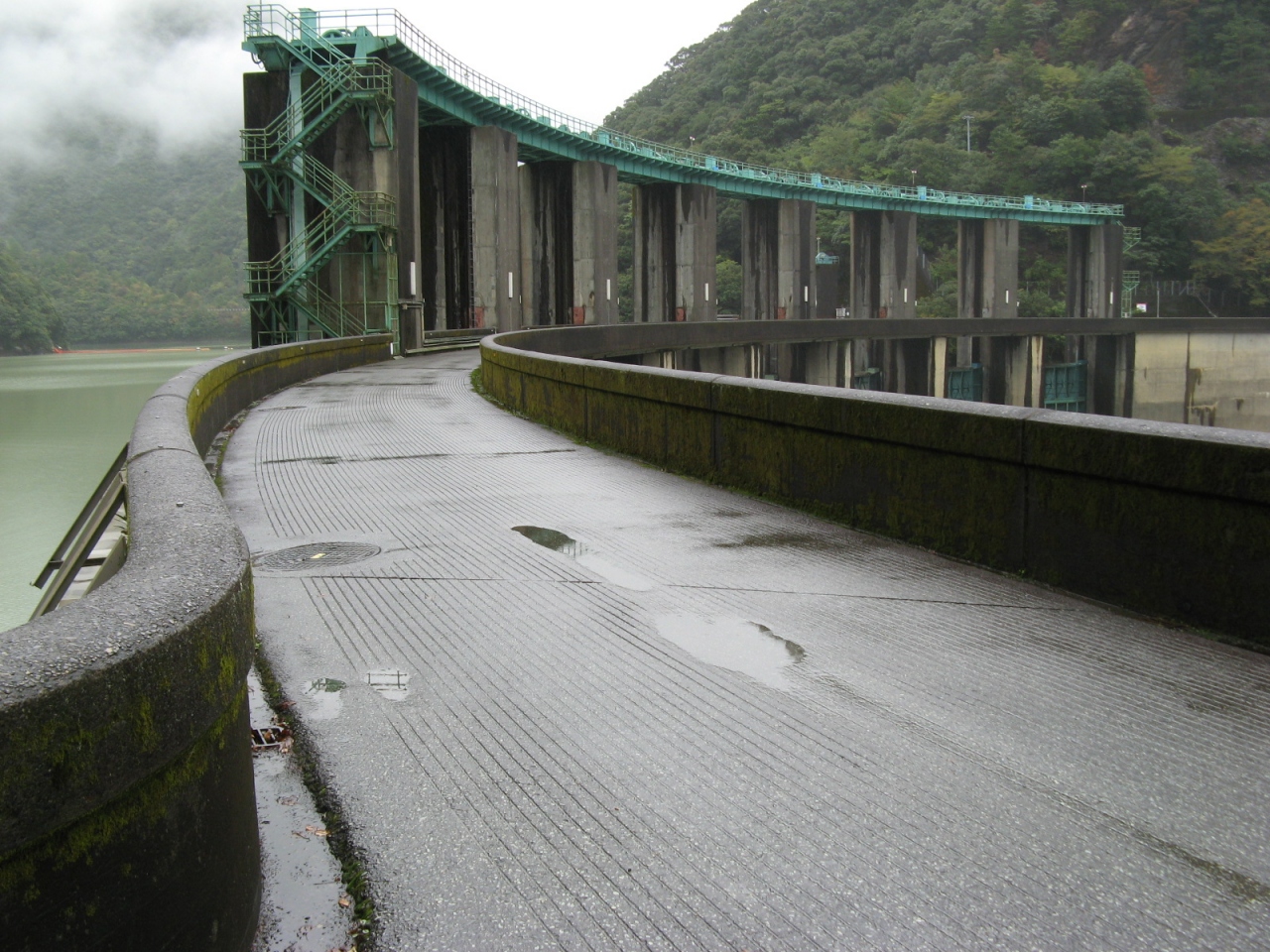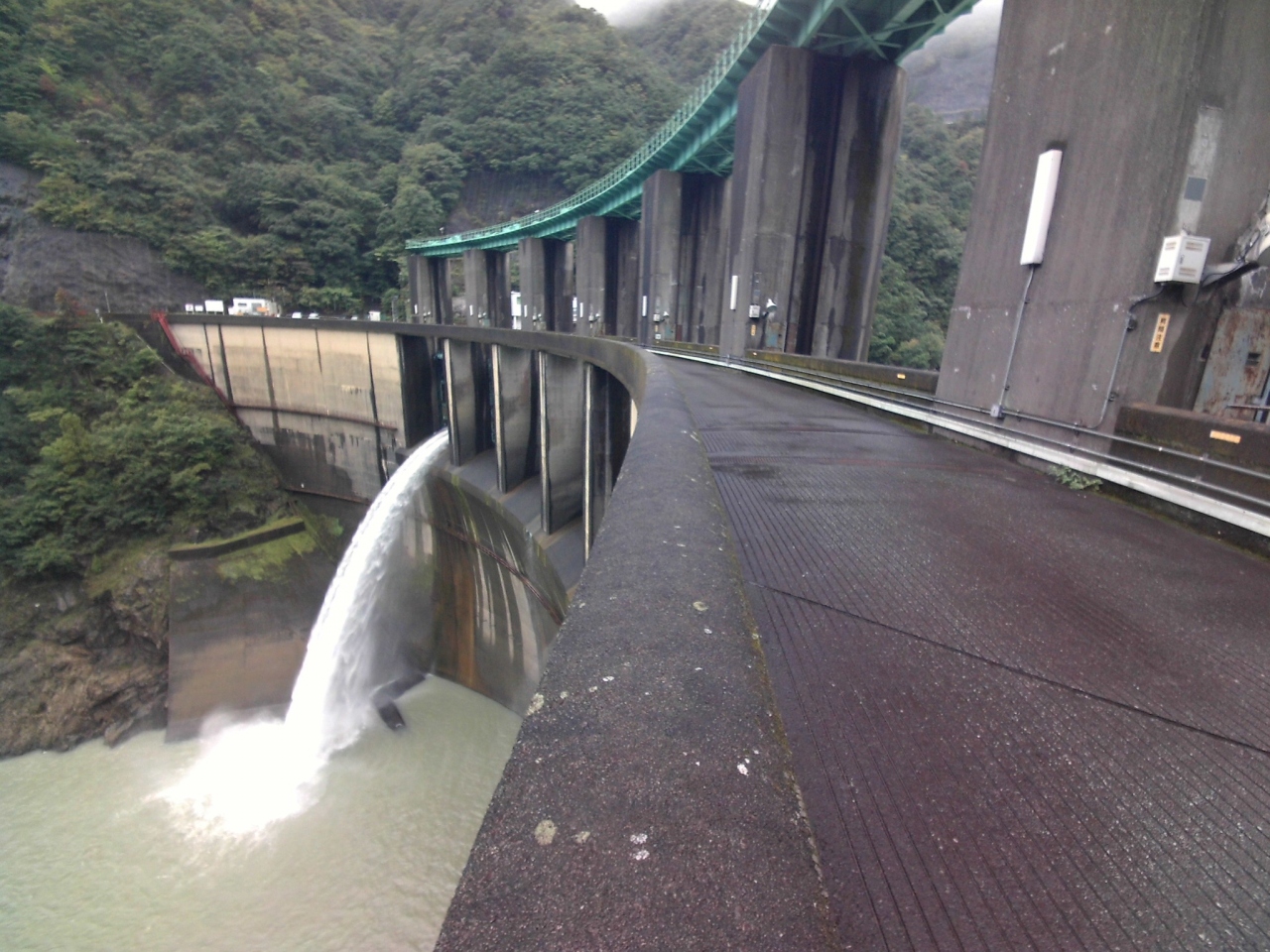 ダム堤体上は車も通行が可能です。高さが76mあり、ダム堤体上から下流側を覗くとそこそこ迫力があり、ゲートから放流している姿を間近で見ることができました。