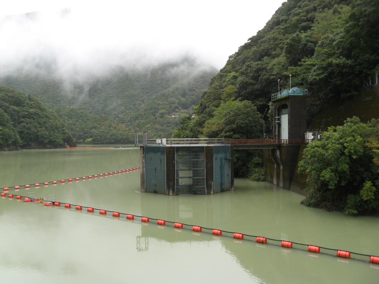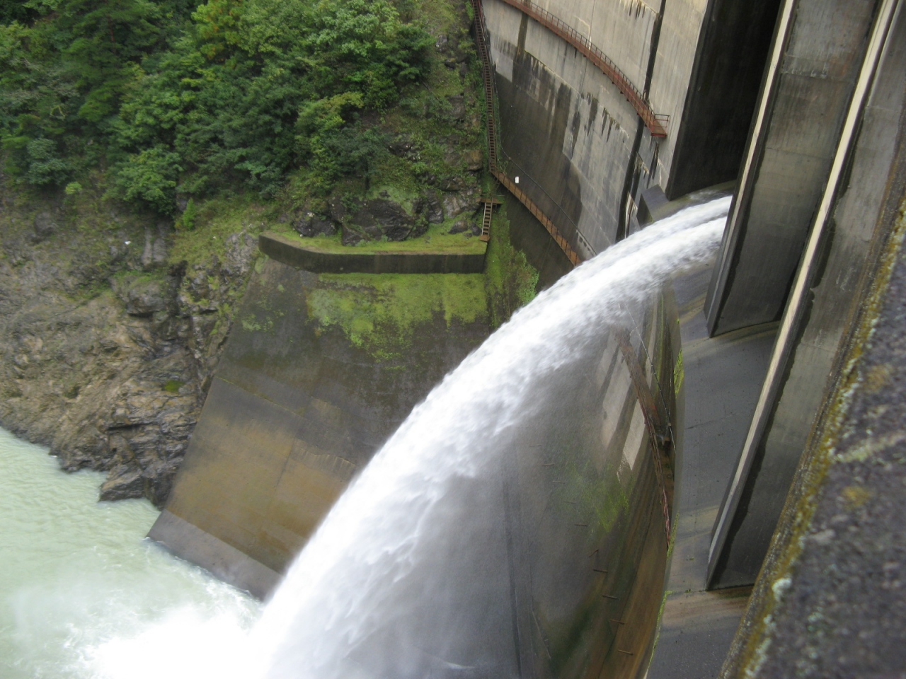 竣工が1962年と比較的古く、洪水吐は巨大なローラーゲート7門を装備していて、訪れたときは河川維持用水の放流中でした。