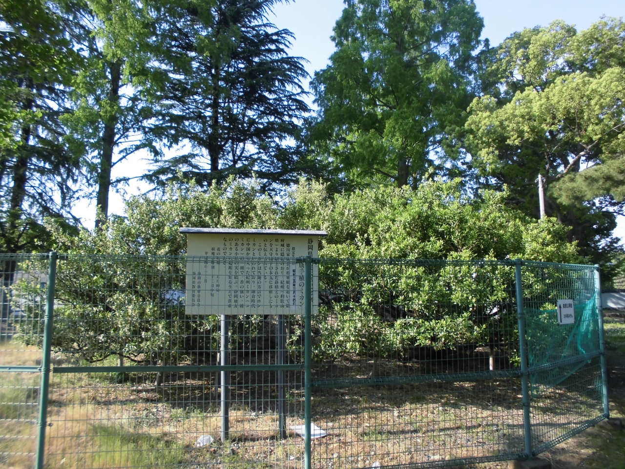 駿府城の真ん中に生えています。地図はあるのですがなかなか場所が見つかりづらかったです。それもそのはずで、意外と木の高さが低いんですね。もっと大きいイメージがあったのでわかりづらかったということです。あとフェンスに囲まれているので近づくことはできません。