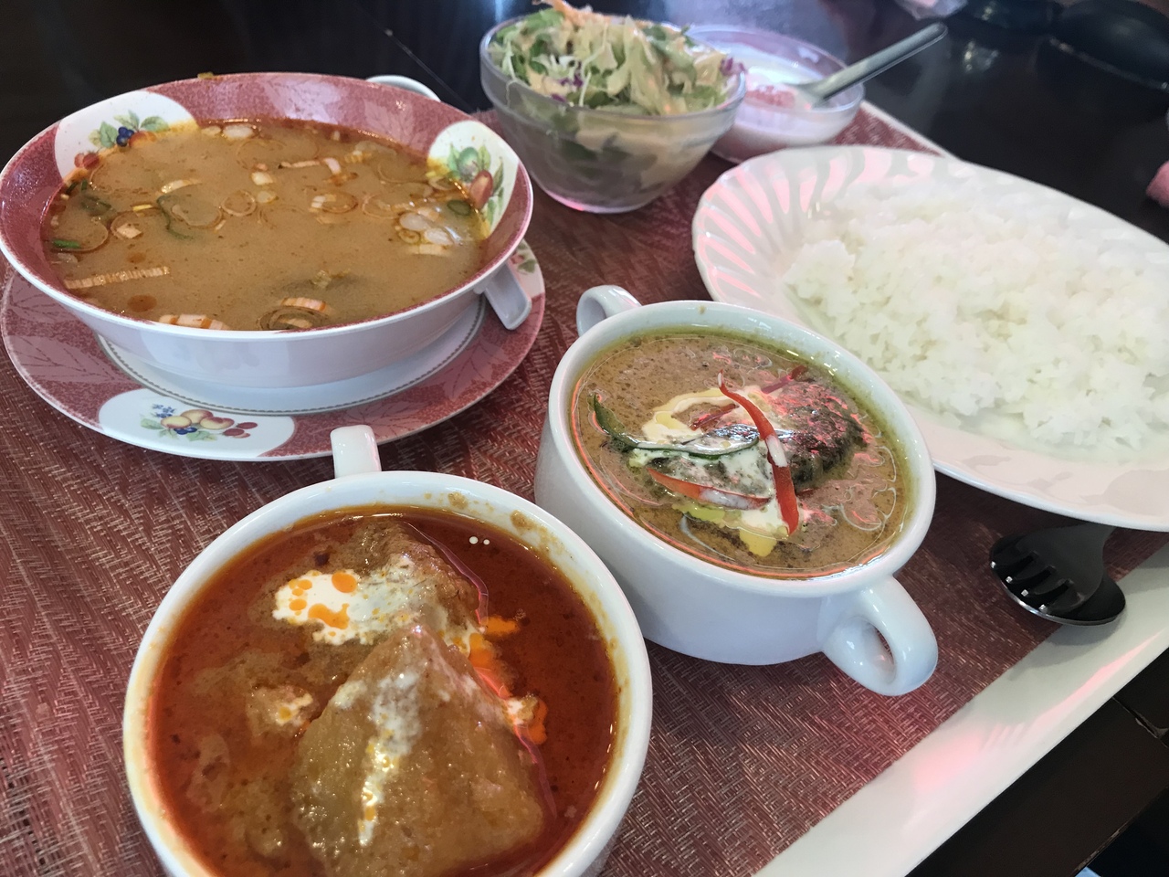 よくばりカレーセットは、1,200円で3種類のタイカレーから2種類を選べるセット。グリーンカレーとマッサマンカレーを選択。辛いのが苦手な人でも食べれる味付け。辛いもの好きには物足りませんが、味付けは美味しいです。具もゴロゴロ入っていて満足感ありです。