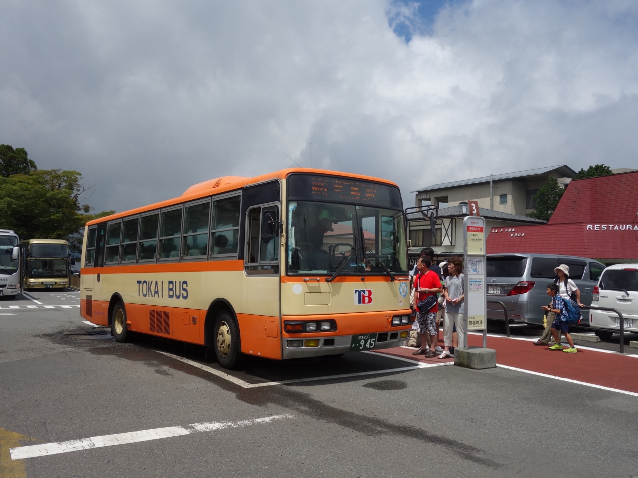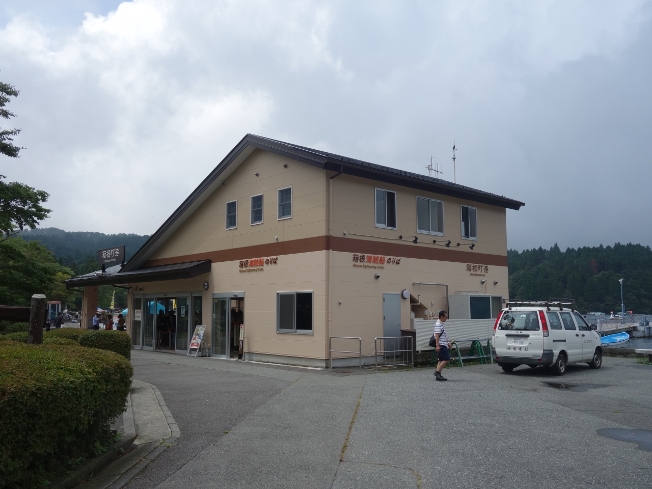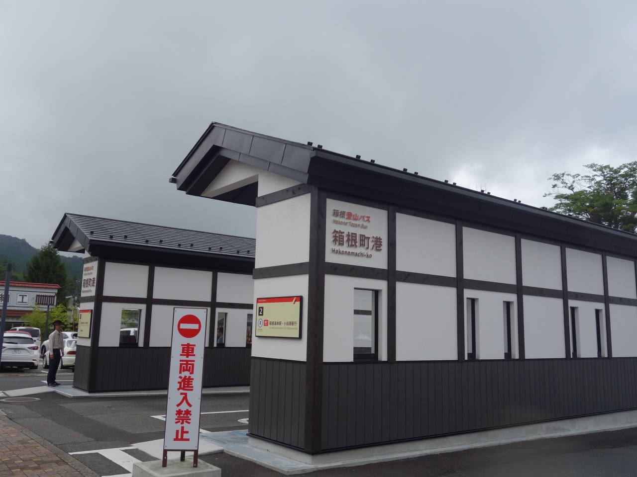「箱根町港」。こんな名前は始めて認識しましたが,(元箱根との区別をしていなかった)気がついてみると,箱根の交通の要所になっています。。三島へのバスの便の終点ですし,箱根湯本へは1号線経由と箱根新道経由のバスのターミナルになっています。また,海賊船は,桃源台からここにつきます。開けたところです。