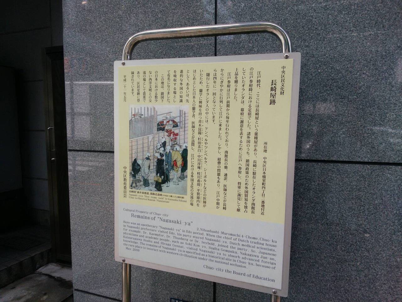 長崎屋跡は、JR新日本橋駅(総武線快速)の入口付近に説明板があるのみでした。江戸時代、ここには長崎屋という薬種屋があり、長崎に駐在したオランダ商館長の江戸登城、将軍拝謁の際の定宿であり、鎖国下における数少ない西洋文明との交流の場として貴重な場所だったようです。当時の面影や遺構などは全くありませんが歴史に興味がある人は立ち寄ってみるのも良いです。