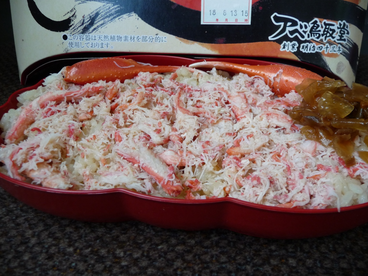 蟹を食材にした駅弁は、「かに寿し」と「かにめし」の二つがあります。売店のおじさんに、「酢飯と普通のご飯の違いですか?」と聞くと、おじさんは大きくかぶりを振って、「いやいや、かにめしは、ご飯をカニ味噌と一緒に炊き込んでいるから、こっちの方が、絶対におすすめだよ」