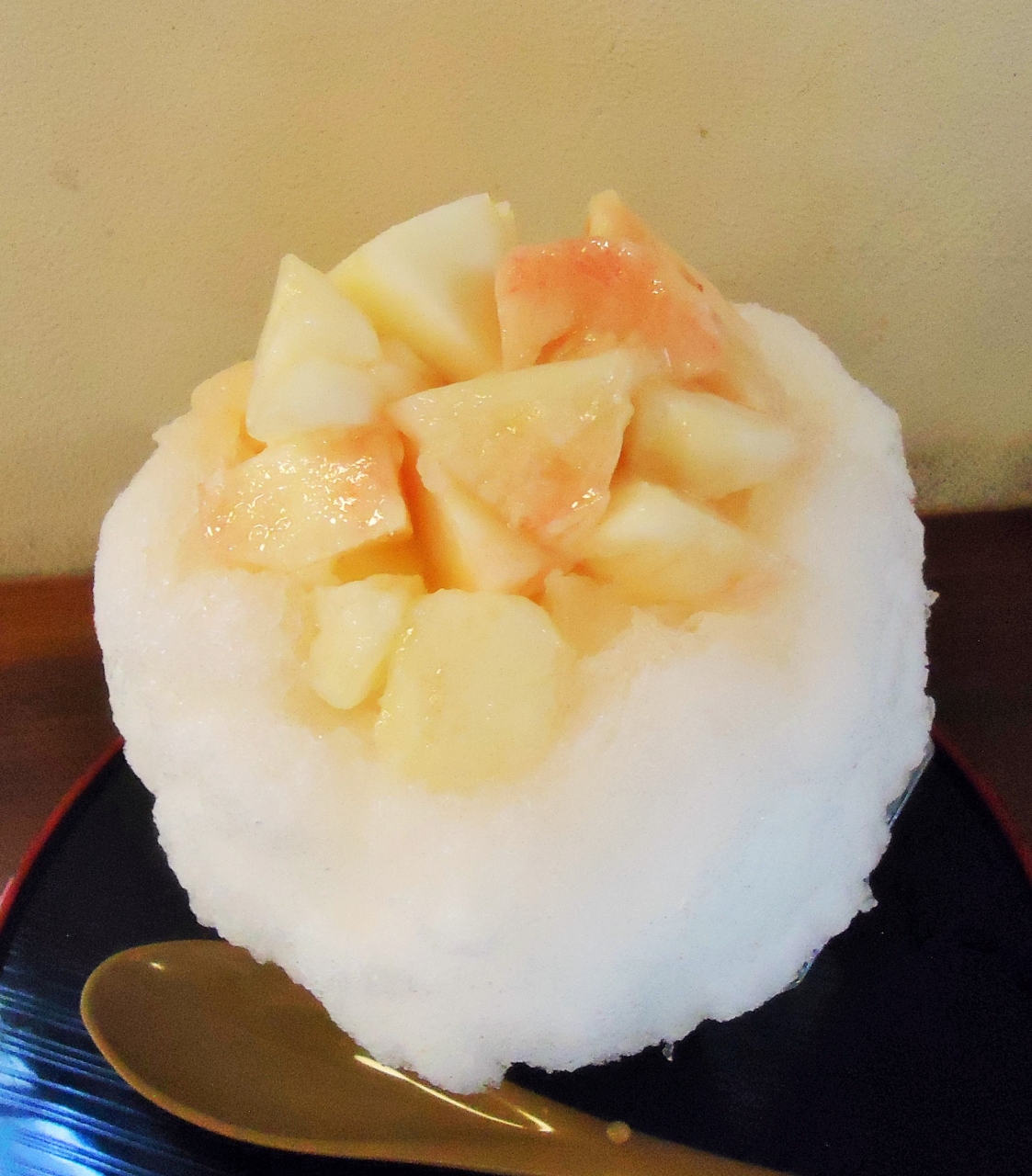 トップに桃の果肉がどっさり、シロップは生姜味で爽やかです。