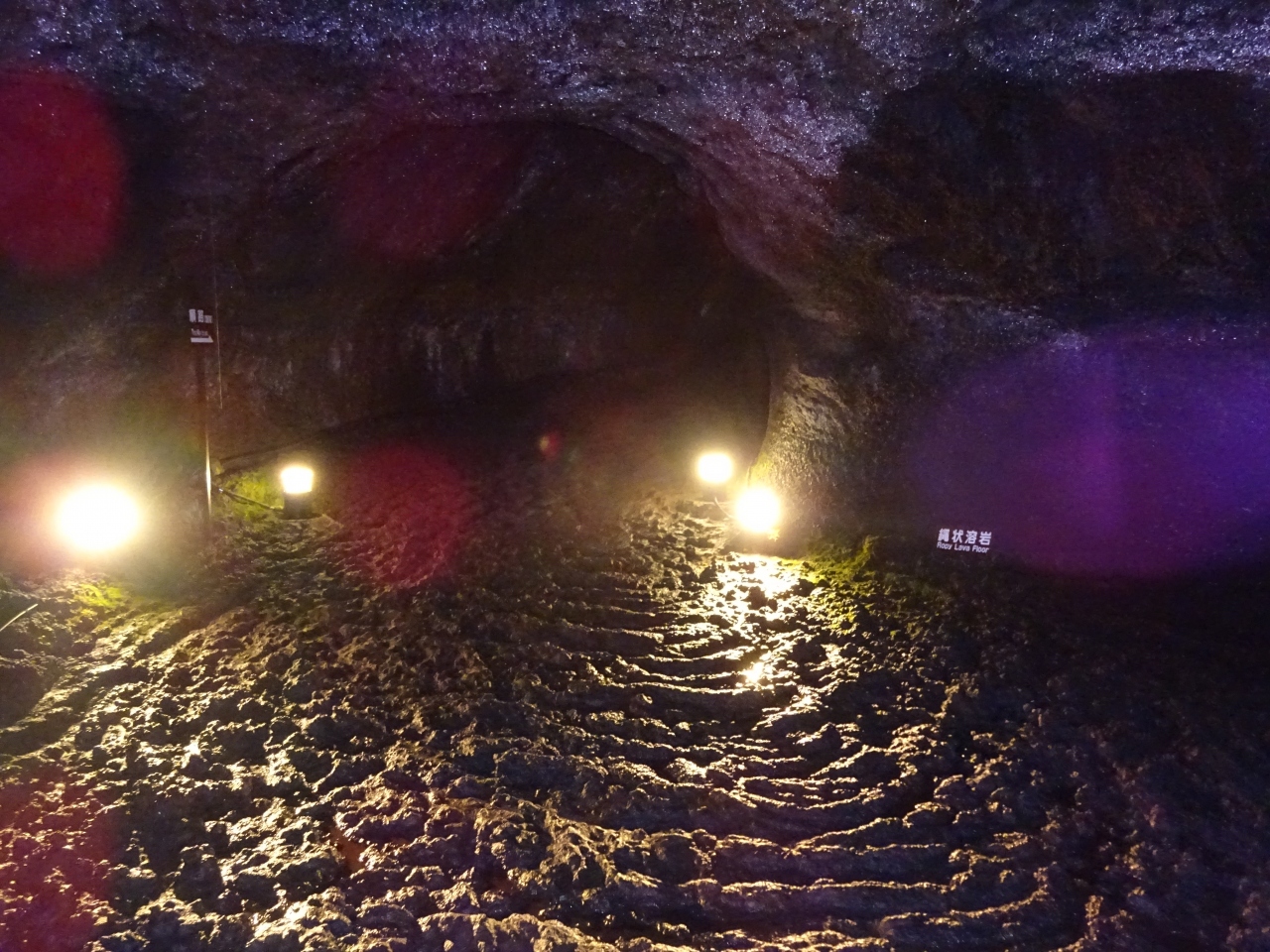洞窟内では、天井から垂れる溶岩鍾乳石や床に広がる縄状溶岩など自然の造形を楽しむことができます。