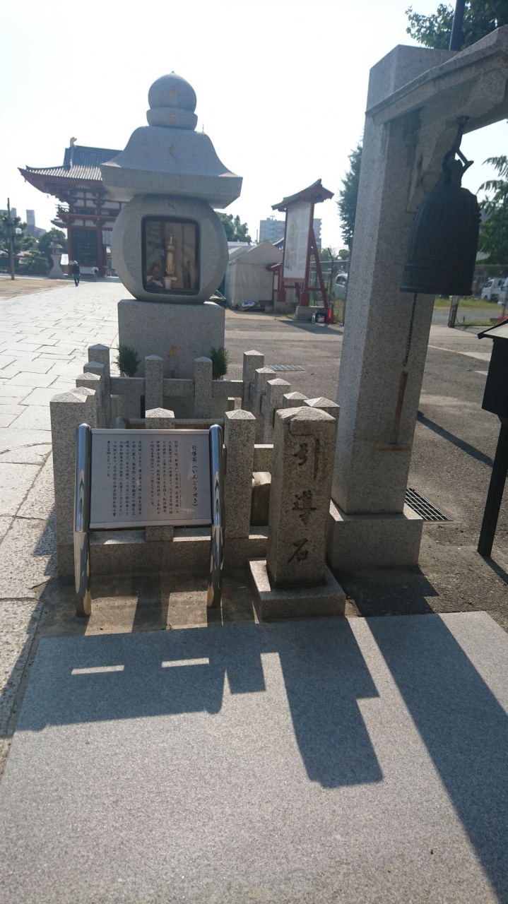 四天王寺の西側にある石鳥居をくぐって入ると右手に「引導石」と「引導五輪宝塔」、「引導鐘」がありました。葬送の際に鳥居の前に棺を置いて鐘を撞けば、聖徳太子が引導石の上に現れて極楽浄土に導いてくれるという言い伝えがあるそうです。それほどの由来があると思えないほど小さな鐘でした。