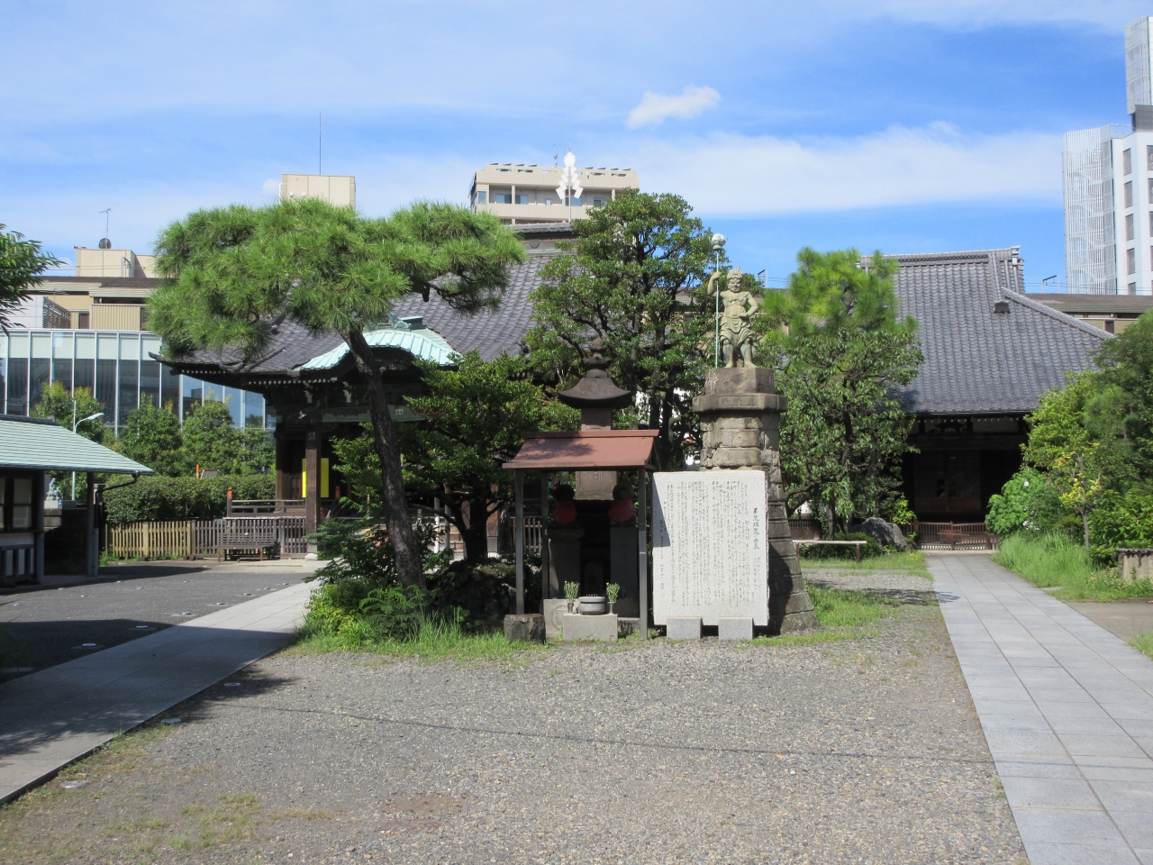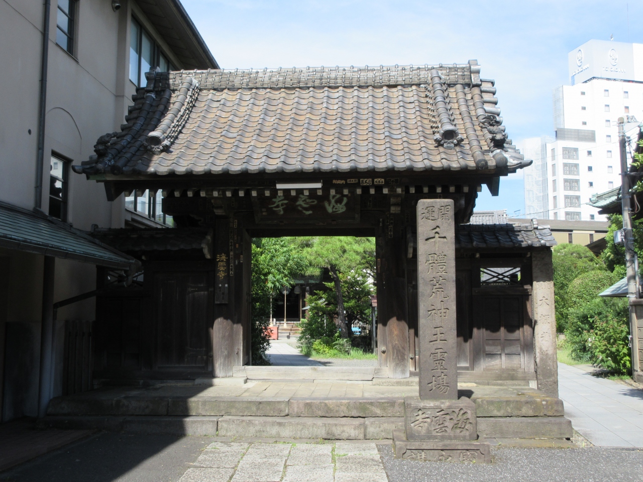 京急線・青物横丁駅の向かいにある曹洞宗の寺院です。入口は旧東海道沿いにあります。本堂には火と水の神として、台所の守るとされる千躰荒神が祀られ、格天井の中央には龍が、その周りには纏図が描かれています。また境内中央には、正直であったために凍死した平蔵にあやかり、浄く正しい心で平和で明るい社会を作ってほしいという願いから平蔵地蔵が祀られています。その後ろには元気がもらえるとされる力石も置かれています。木造の山門も堂々としていて趣があります。色々な御利益があるのか、朝から参拝に訪れる人が見られたのが印象的でした。