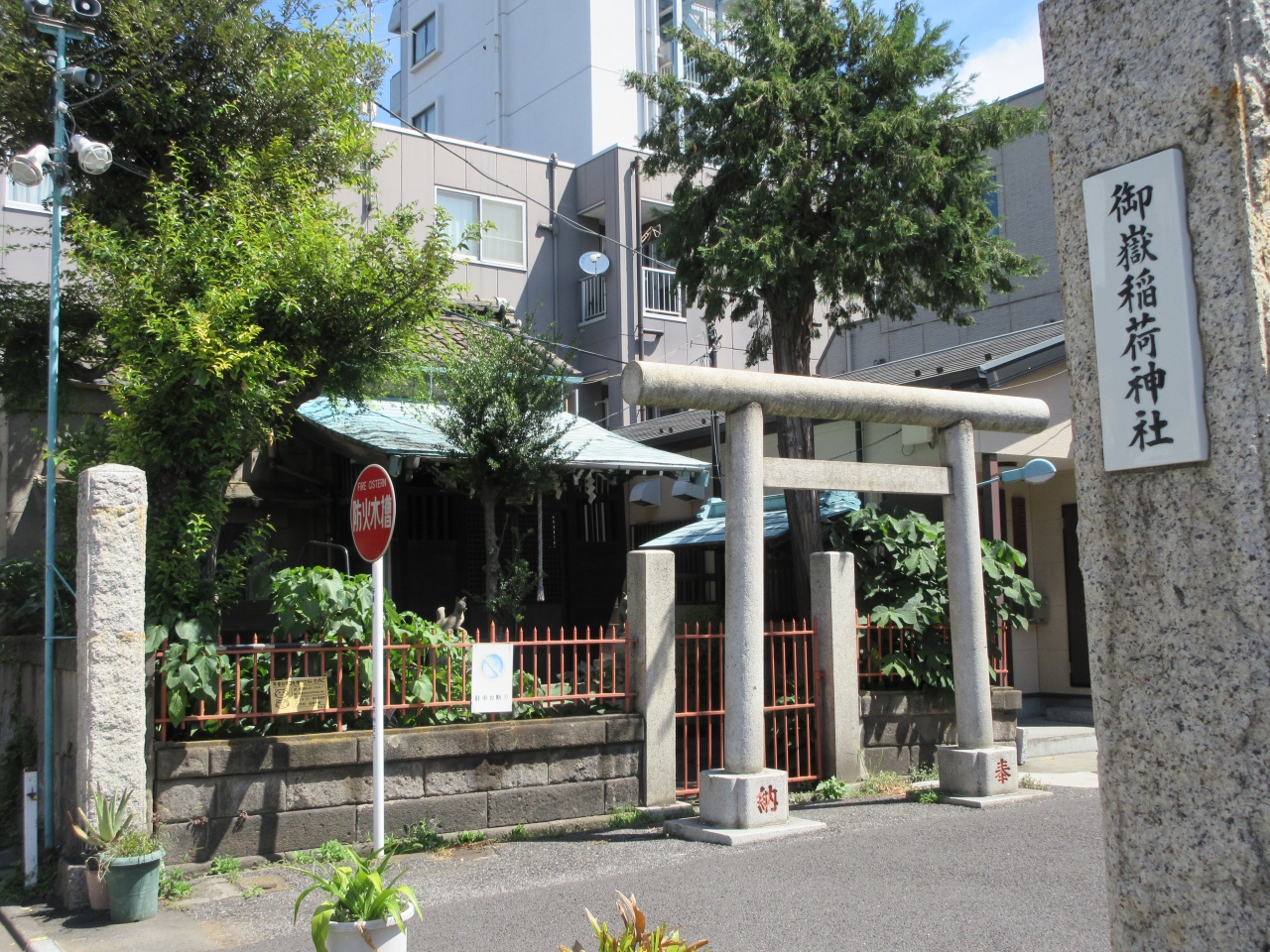 京急線・新馬場駅近く、旧東海道を1本入った住宅地にひっそりと建っています。品川に元々あった三岳権現社と稲荷社が合祀したようです。こじんまりした社殿の前には、可愛らしいキツネとコンクリート製の鳥居が建っていました。地元密着の神社だと思いますが、鳥居が建つ広場に自転車が数台駐車していて、景観が損なわれているのが残念でした。