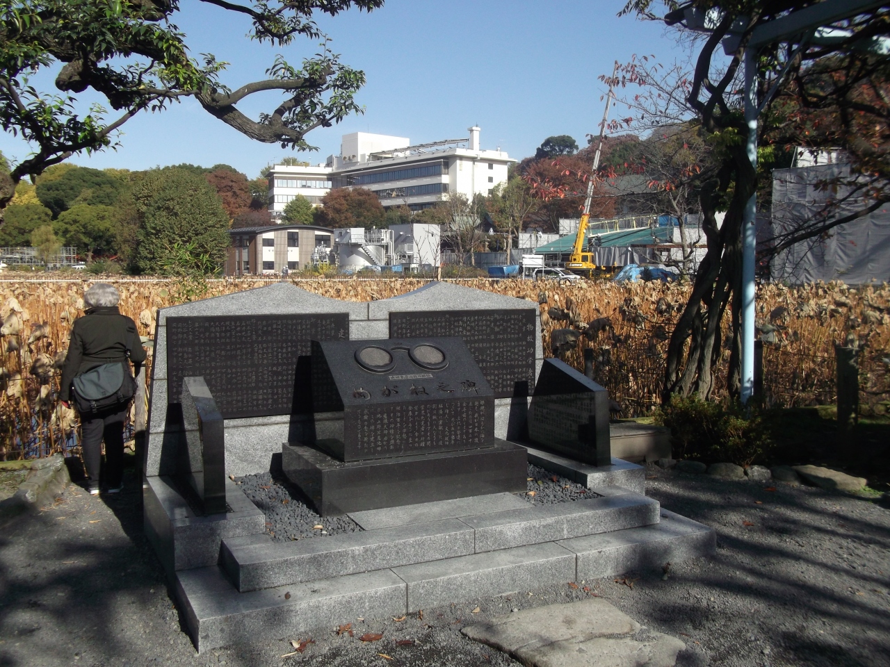 不忍池の弁天島の参道沿いにある石碑です。碑には徳川家康が所持していたという丸いメガネが彫られています。メガネは400年を超える昔に伝来したものなのですね。碑文には、文化や経済への貢献は大きなものがあるとも記されていました。こういう機会にメガネのありがたみを思い起こしてみるのもいいかもしれませんね。