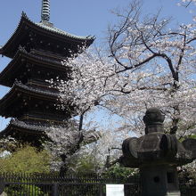 上野東照宮のすぐ隣にある、ドンと空に向かってそびえたつ旧寛永寺の五重塔です。ちょうどサクラの満開の時期に訪れました。東照宮の参道からはすぐ近くにこの塔を眺めることができ、満開のサクラと一緒に見える景観はとても絵になっていました。
