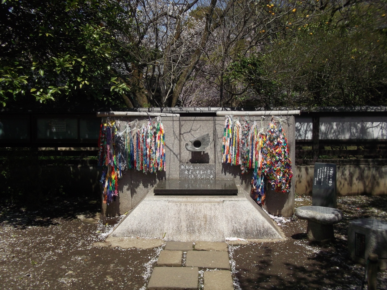 上野東照宮の参道沿いの一角にこの石碑があります。石碑の両側にはたくさんの千羽鶴がかざられ、中央には広島・長崎から移された火がともされていました。石碑のそばにはその由来が記されていて、石碑を眺めながら改めて平和の尊さを感じました。