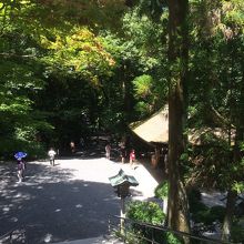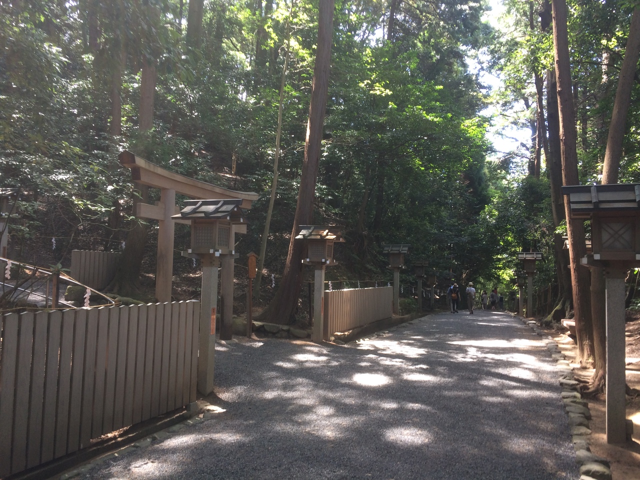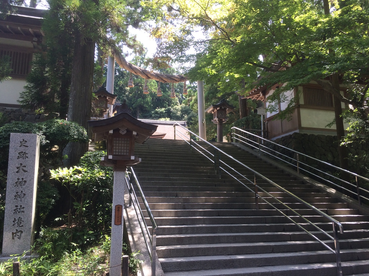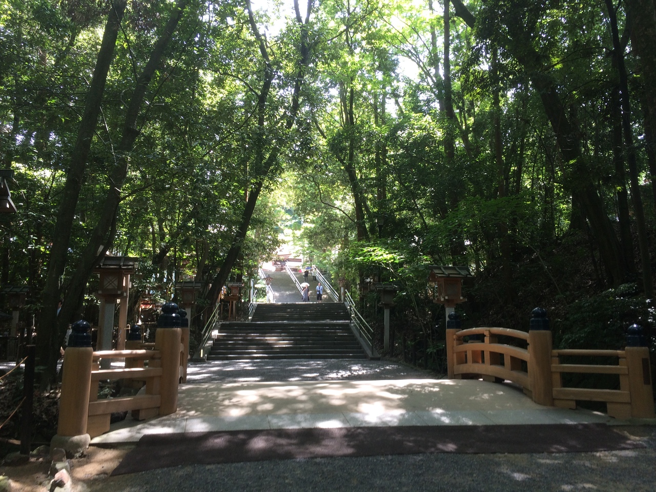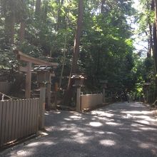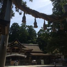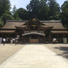 参道入り口の鳥居が巨大で迫力があります。長い参道でところどころ土産がありますが、連なってはいなく、ぽつんぽつんと点在していました。奥の拝殿に向かう砂利道の左右は木々に囲まれ神社らしい雰囲気でした。境内が広く、ほとんど周遊したので1時間以上滞在しました。大きな杉が目立つ神社でした。