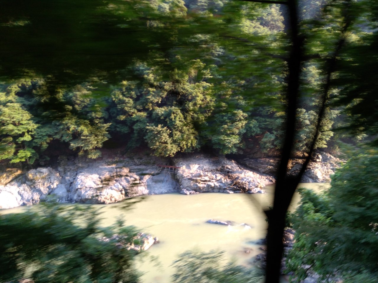 上り電車に乗りました。帰りは川下りをしたかったけれど、台風が通ったあとだったので、水かさが増してできませんでした。電車から見える木はほとんど、紅葉で秋の紅葉の時期に来ると最高だなとおもいました!次は秋に行きたいです!
