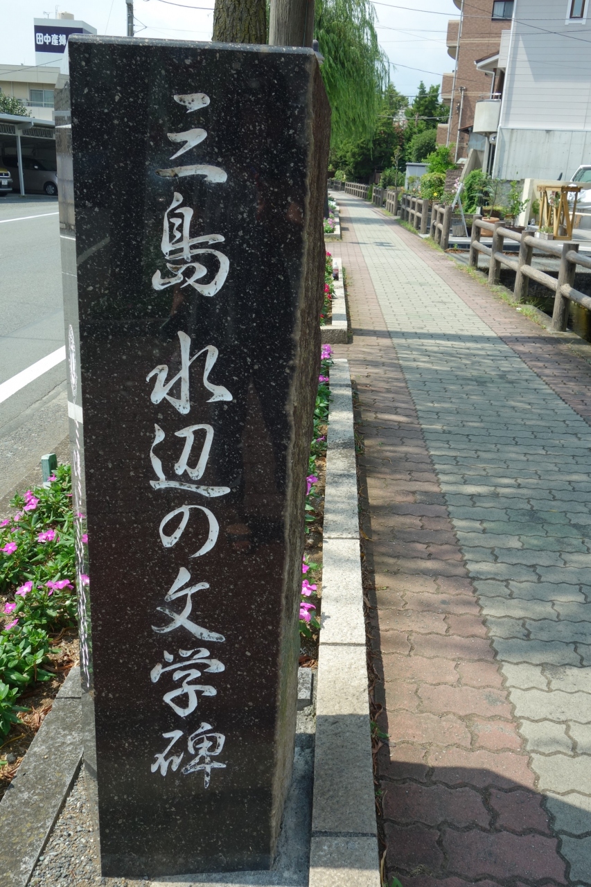 桜川沿いなので「水辺の」文学碑です。三島ゆかりの文学者12名の作品の一部を彫った日が並んでいます。勿論誰もが知ってる名前ばかりです。昨今の猛暑では炎天下にゆっくり碑を読んで廻る余裕は無いでしょうが、2つの観光施設を結ぶ道なので、通った際にはどなたの碑が在るかくらいは見ておいてください。