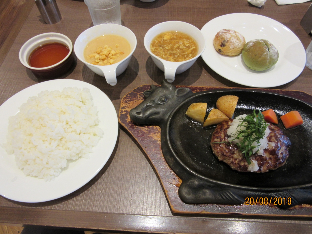私はおろしハンバーグランチを注文。スープ付きで約1,100円でした。ハンバーグではビッグボーイが有名ですが、やはりフォルクスはステーキやハンバーグではファミレスで群を抜いています。サラダバーも充実しており、特にランチに付くスープは3種類あり、