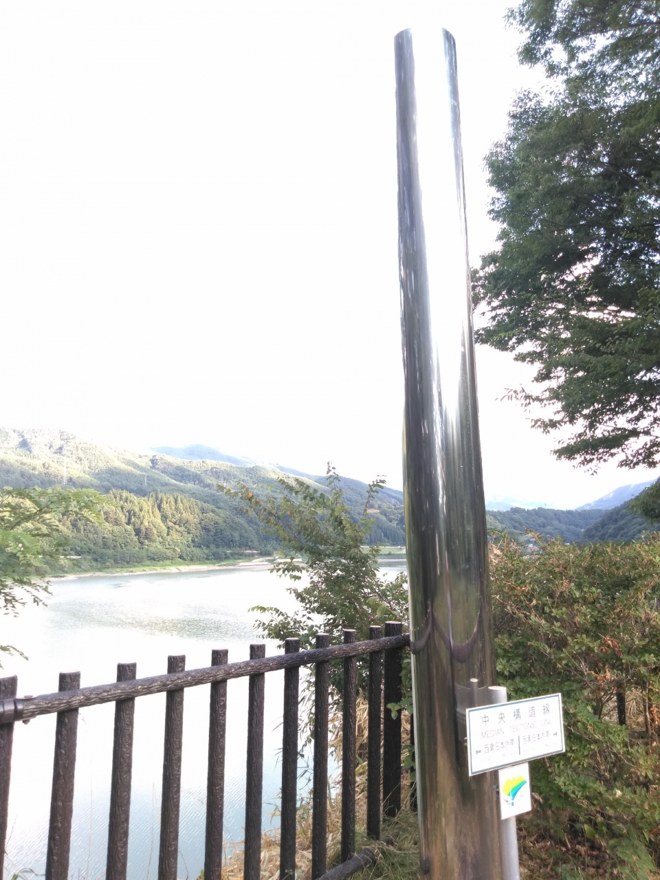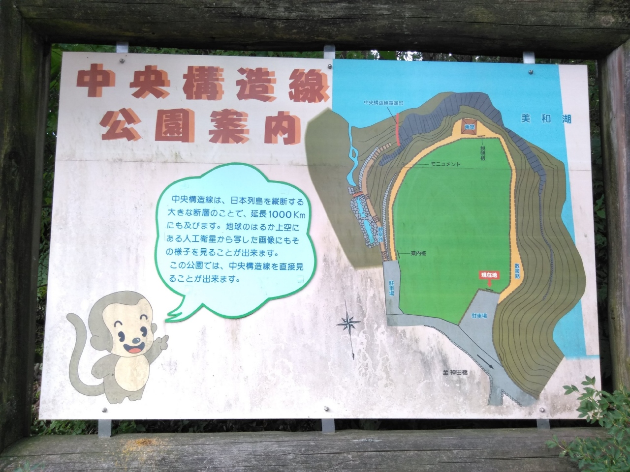 無料の駐車場があります。そこに公園の案内板があって、「観察路」とある道を下に降りると「中央構造線露頭部が見える崖 溝口露頭」があります。その詳しい説明もあります。戻って案内板の先に行くと、「中央構造線」のモミュメントや東屋があります。色々勉強になりました。