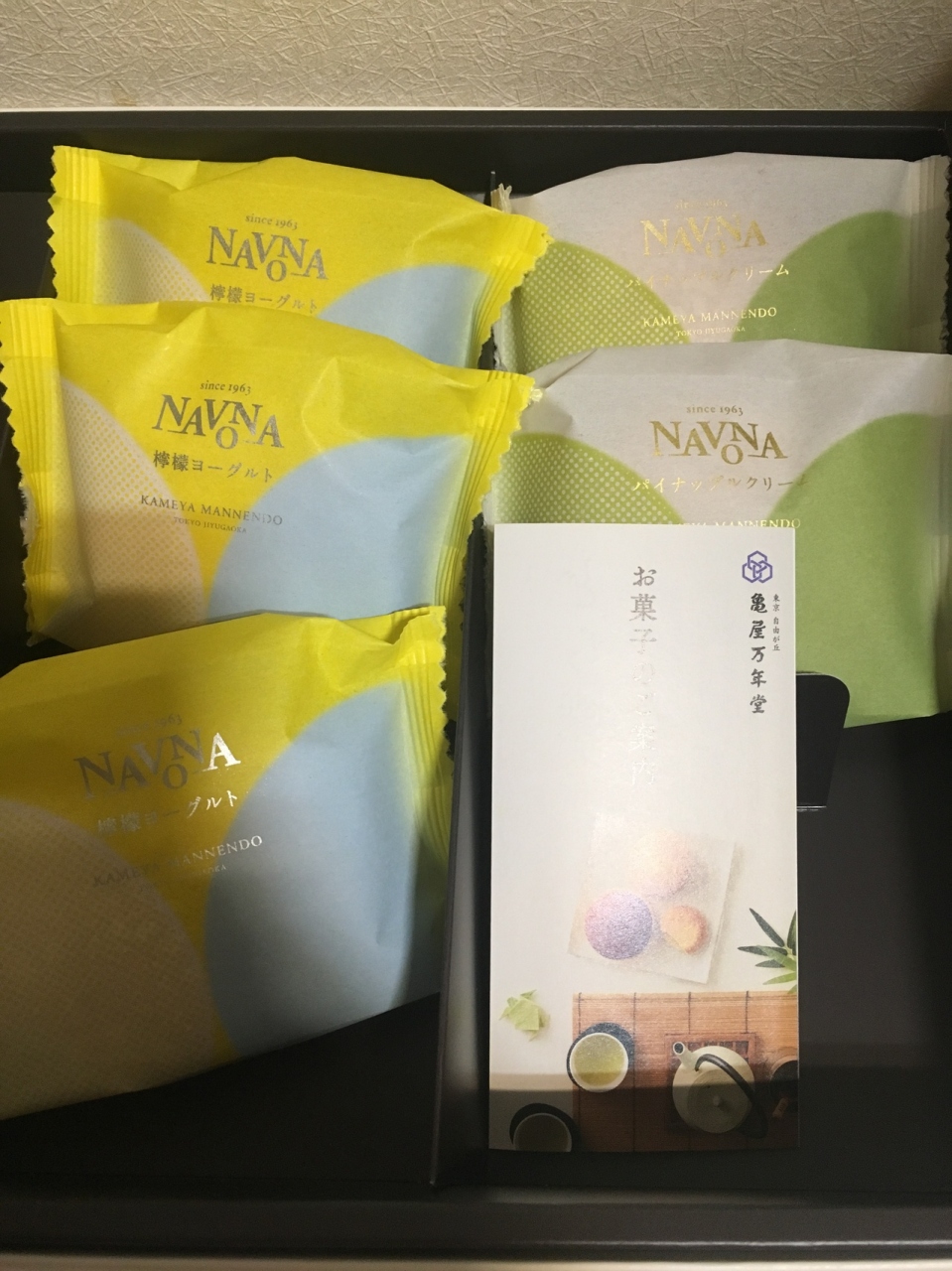 溝の口のマルイにある亀屋万年堂に購入しに伺いました。夏の季節限定の檸檬ヨーグルトを食べました。ヨーグルト味のクリームがたっぷりと挟まっていて、ナボナの中央には檸檬ジャムがあり爽やかで美味しいナボナでした。