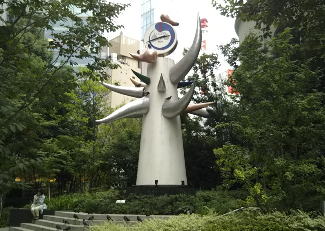 時計の文字盤は顔で、胴の部分にはツノのようなものがニョキニョキと生えています。夜になると、顔やツノは様々な色で光りだします。岡本太郎はこの作品について八方に意欲をつきだし情熱をほとばしらせて生きるべき人間の本来の姿、若々しく、のびきった姿をうちだしたといっています。さらにそれは、のびていく日本の、そして東京の象徴であるともいうのです。』