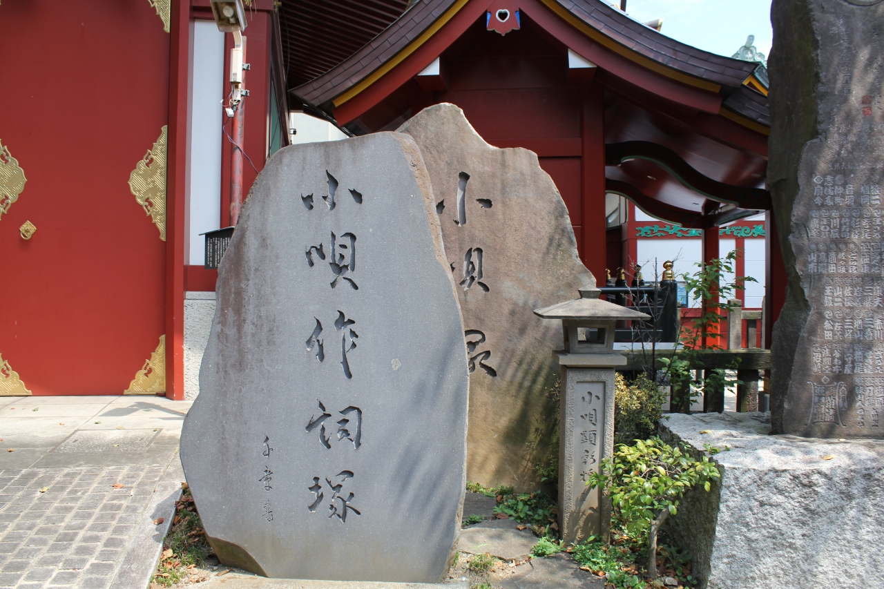 8月のお盆休み家に誰もいなくて暇だったので一人でぶらりと神田明神までお参りに行きました。大鳥居をくぐり抜け随神門を通り神田明神の境内に入りました。お参りを済ませ喫煙所に行くと奥にも石碑や神社があったので行って見ました。小唄を塚にするなんて江戸の粋なところを感じました。