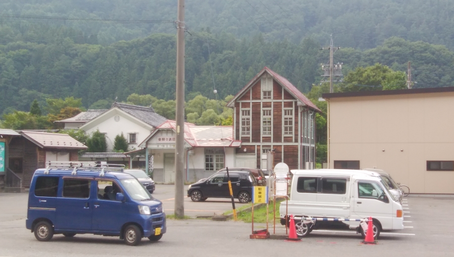 新島々駅は上高地などへのバスの乗り継ぎ地点、駅前にバス発着所がありますが、車道を挟んだ場所にポツンと置かれています。