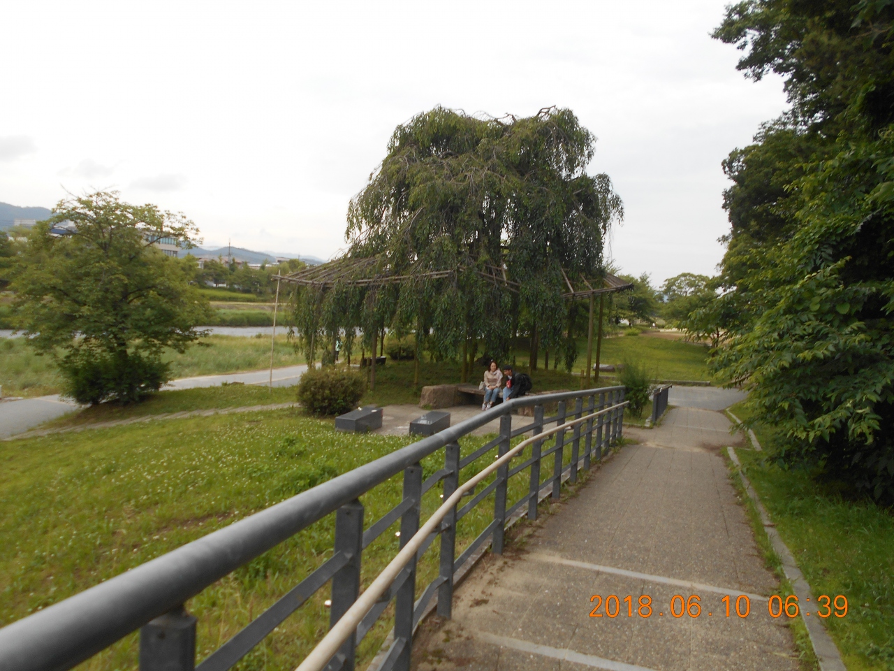 上賀茂神社へ行く途中に見かけたのですが 加茂大橋の近くに広がっている広い公園で 早朝の時間帯には 鴨川沿いの道をランニングなどしている人を見かけました。加茂大橋の横からは鴨川べりへ降りるスロープなどもありました。