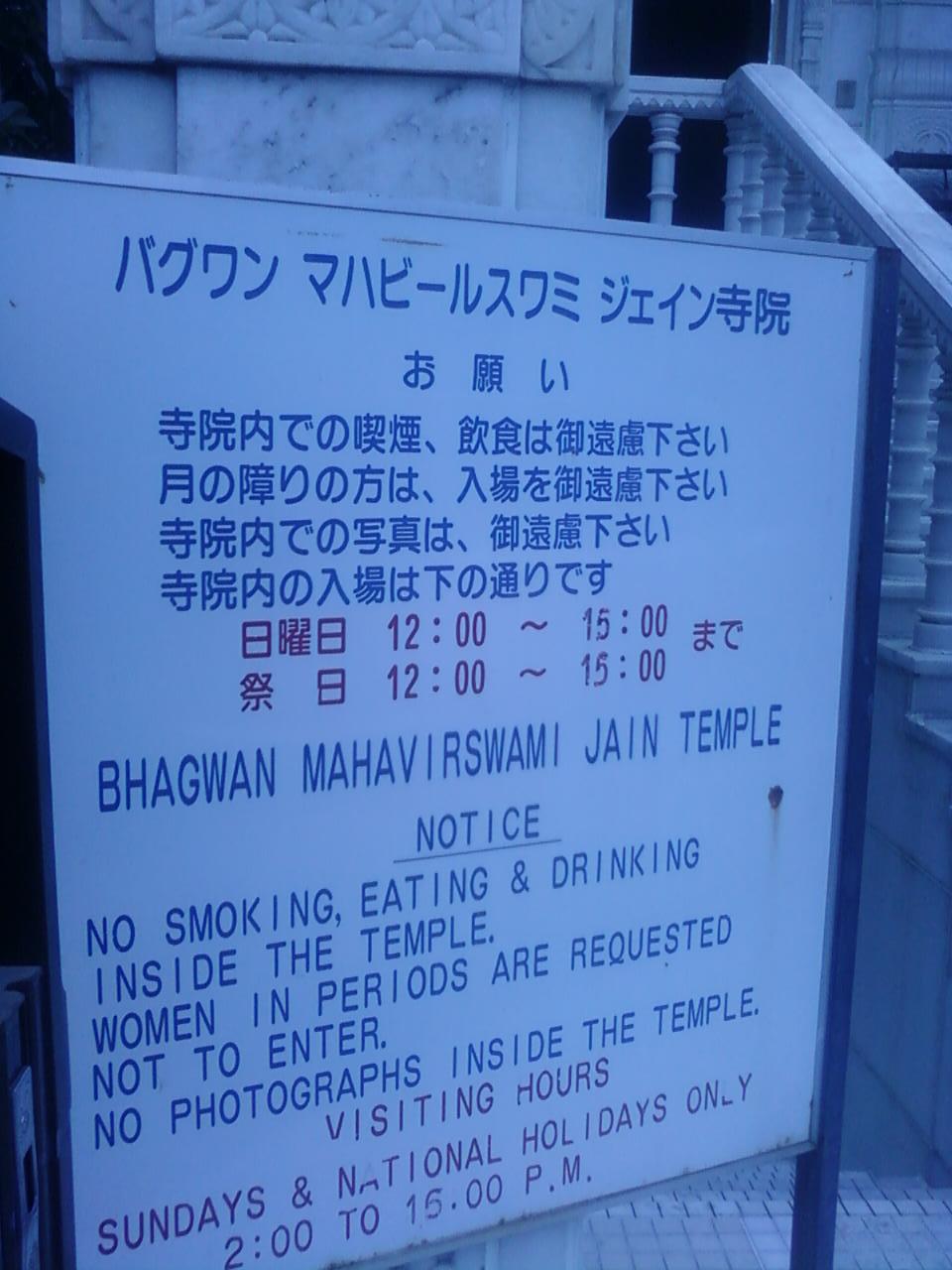 バグワン・マハビール・スワミ・ジェイン寺院は、ジャイナ教の寺院です、不殺生、非暴力、貞潔、不所持などを説いています。神戸北野のハンター坂と北野坂の間くらいの位置にあり、萌聴の館もそれほど遠くはありません。寺院内には二階と地下に行くエレベーターがありますが、一階と言われる場所にも外から階段で登っていきます。ドアがオープンにはなっていましたが、女性は月のものがある時は中に入れませんので、注意が必要です。