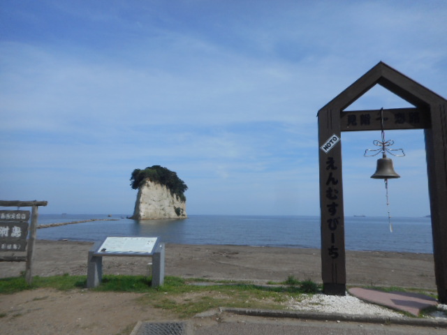 夏の能登半島ドライブ観光で、軍艦に似ている有名な見附島を訪問しました。この見附島があるのがこちらの海岸です。海岸には鐘やパネルなどのフォトスポットがありますし、海岸沿いから道が伸びていて、島まで歩いて行けました。でも、結構ガタガタしているし、途中水がかかる場所もあるので、ぬれてもいい靴で!