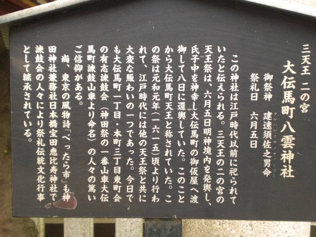 神田明神の大伝馬町八雲神社は、江戸時代以前に祀られていて、大伝馬町天王とも称されていました。