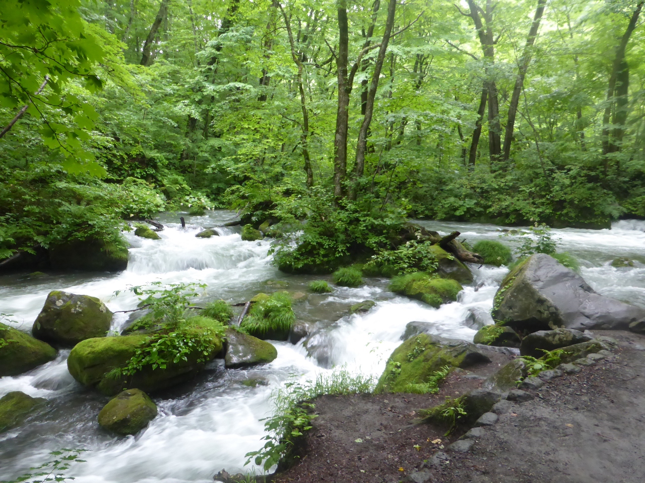 奥入瀬渓流のちょうど中間、「阿修羅の流れ」の近くでたくさんの岩がある場所が「九十九島」と呼ばれる場所です。